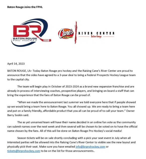 Professional Hockey Returns to Baton Rouge in Late 2023