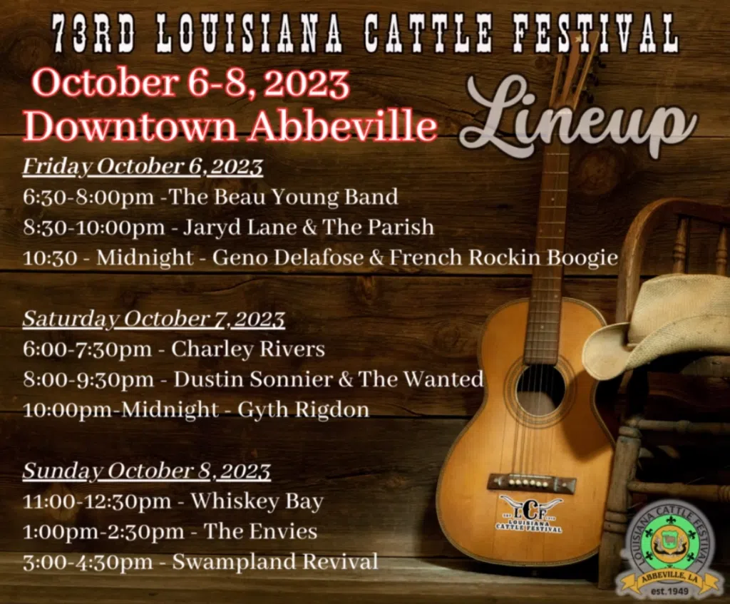 Join us on October 6-8, 2023 in downtown City of Abbeville, Louisiana for the 73rd Louisiana Cattle Festival!