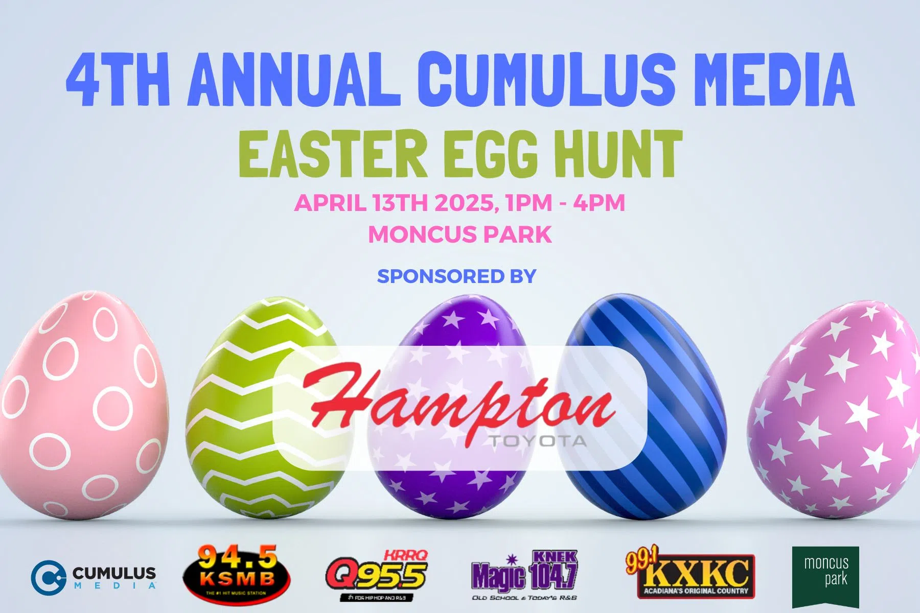 Join Us on Sunday April 13th, 2025, from 1pm – 4pm at Moncus Park for the 4th Annual Cumulus Media Easter Egg Hunt sponsored by Hampton Toyota.
